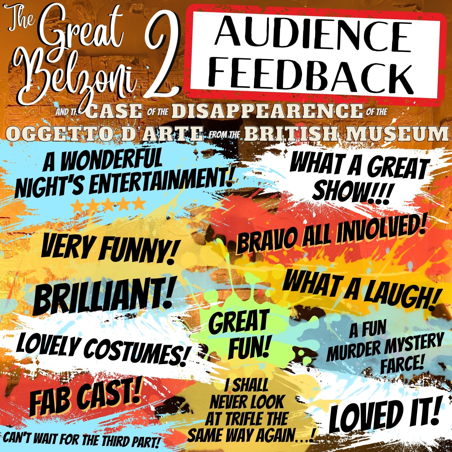 Five of the cast return from last year’s Great Belzoni whodunit, some playing the same character, some playing a new one… it doesn’t matter, the whodunit is original and everything you need to know, you will you will be told.
